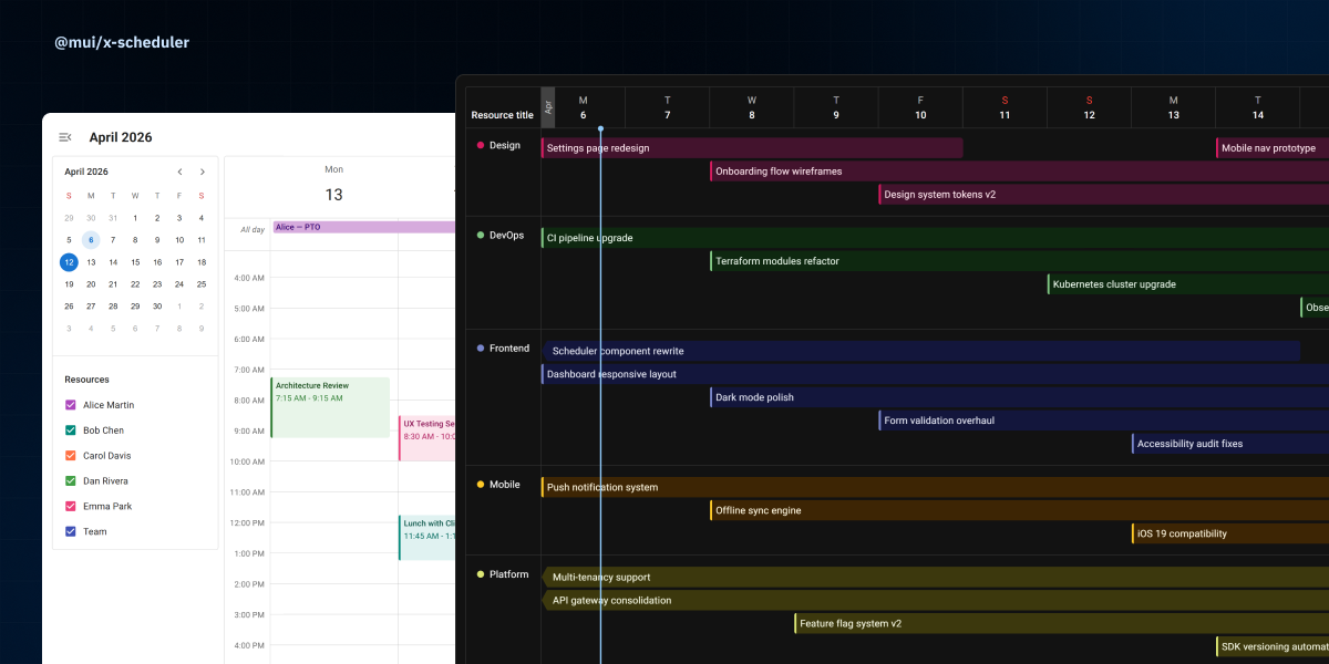 Install the package and render the Scheduler in minutes: start in the MUI X Scheduler docs and follow the quickstart guide for your first working calendar. Then layer your event model and resources on top, and switch to Event Timeline when your use case needs dense resource planning.